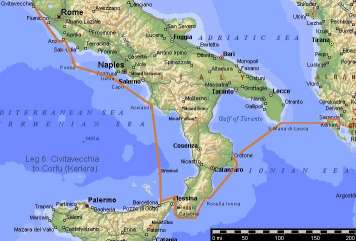 I arrived and moored at Reggio Calabira, a thoroghly unpleasant marina right next to the entrance of the port, so that all the ferries send visiting boats rocking like crazy. The water is filthy, it has no toilets or potable water but charges £50,000 a night, the largest fee I had to pay in Italy. But there was a charming Danish couple - Stefan and Lorna - in their boat Cat Coquette, moored close by, also bound for Greece but awaiting a new engine. They came over for drinks in the evening and told me about a storm they had encountered in Portugal when Lorna and another crew member were swept overboard by a freak wave. Stefan was unable to pick them up as they were dangerously close to the coast, but they were amazingly picked up by the emergency services.